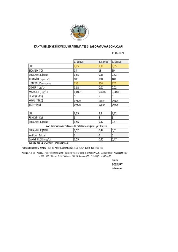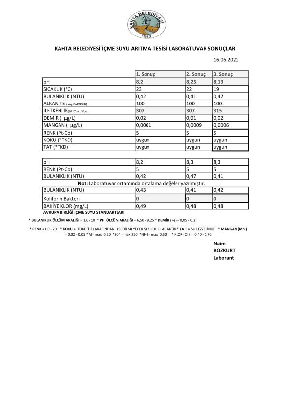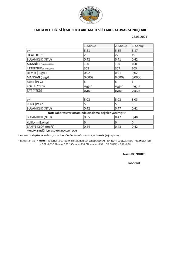 Ayrıca, ekiplerimiz tarafından arıtma tesisinde teknik ekiplerce beraber günlük farklı zaman aralıklarında rutin olarak içme suyu analizi yapmakta ve bunlar raporlanmaktadır. Yapılan tahlil sonuçlarında, hastalığa zarar verecek herhangi bir sorun görülmemektedir. Tahlil sonuçlarımız Avrupa Birliği İçme Suyu standartlarına uygundur.