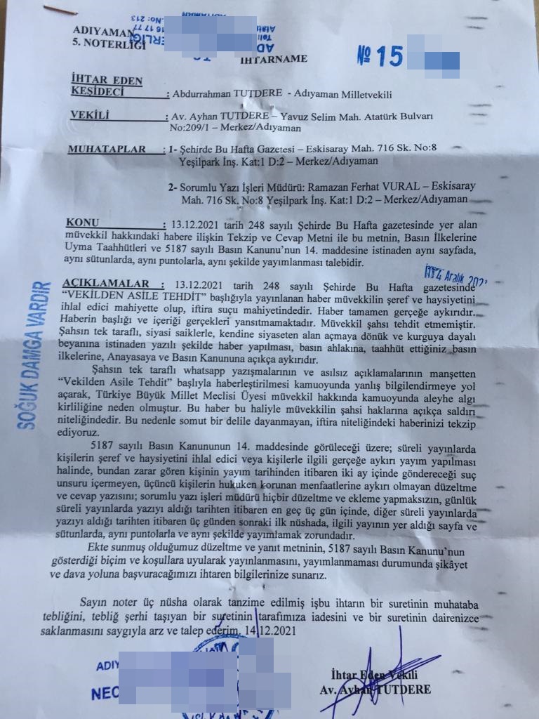 “13.12.2021 tarih ve 248 sayılı Şehirde Bu Hafta gazetesinde “VEKİLDEN ASİLE TEHDİT” başlığıyla yayınlanan haber müvekkilimin şeref ve haysiyetini ihlal edici mahiyette olup,iftira suçu mahiyetindedir. Haber tamamen gerçeğe aykırıdır. Haberin başlığı ve içeriği gerçekleri yansıtmamaktadır. Müvekkil şahsı tehdit etmemiştir. Şahsın tek taraflı, siyasi saiklerle, kendine siyasetten alan açmaya dönük ve kurguya dayalı beyanına istinaden yazılı haber yapılması,basın ahlakına,taahhüt ettiğiniz basın ilkelerine, Anayasaya ve Basın Kanununa açıkça aykırıdır.