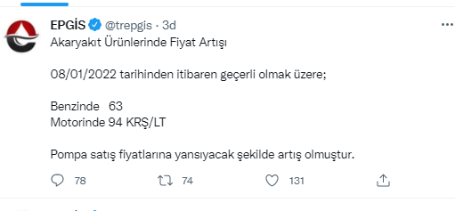 “08/01/2022 tarihinden itibaren geçerli olmak üzere; Benzinde 63 Motorinde 94 KRŞ/LT Pompa satış fiyatlarına yansıyacak şekilde artış olmuştur ”denildi.ŞEHİRDE BU HAFTA