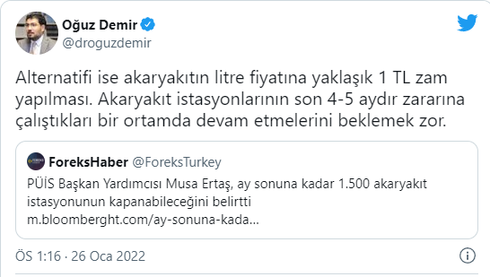 Demir ''Alternatifi ise akaryakıtın litre fiyatına yaklaşık 1 TL zam yapılması. Akaryakıt istasyonlarının son 4-5 aydır zararına çalıştıkları bir ortamda devam etmelerini beklemek zor'' dedi.KARAR