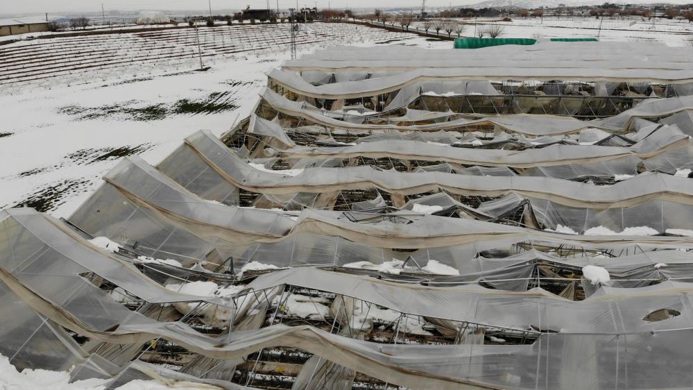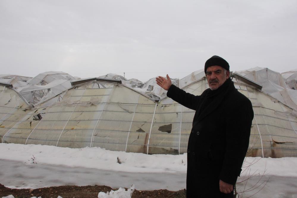 Adıyaman’da 15 dönüm kapalı alana sahip sera yoğun kar yağışına dayanamayarak çöktü. Seradaki tonlarca ürün çürüdü.