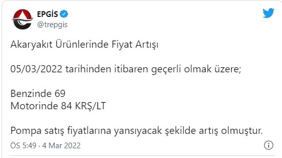 Enerji Petrol Gaz İkmal İstasyonları İşveren Sendikası’nın (EPGİS) yaptığı duyuruya göre, bu gece yarısından itibaren geçerli olacak şekilde benzinin litre satış fiyatına 69 kuruş, motorinin litresine de 84 kuruş zam yapıldı.