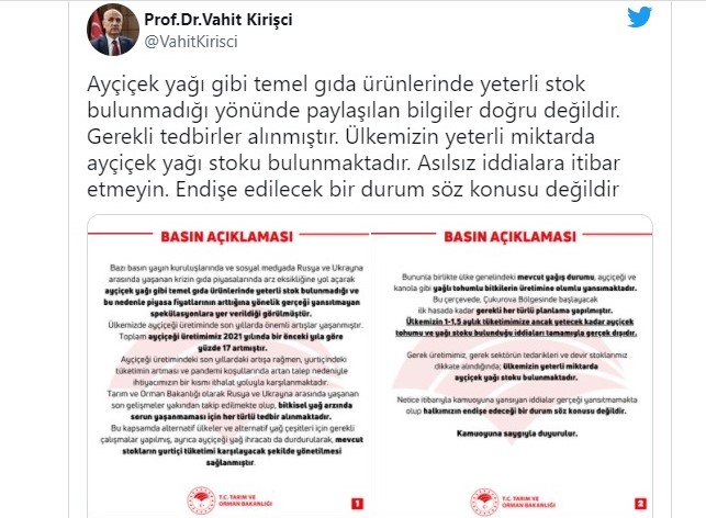 Tarım ve Orman Bakanı Vahit Kirişci, Rusya-Ukrayna savaşının gıda piyasasında arz eksiliğine yol açarak temel gıda ürünlerinde yeterli miktarda ayçiçek yağı stoğunun bulunmadığı iddialarına ilişkin açıklamalarda bulundu. Kirişçi, haberlerin doğru olmadığını belirterek, "Ülkemizin yeterli miktarda ayçiçek yağı stoku bulunmaktadır." dedi.