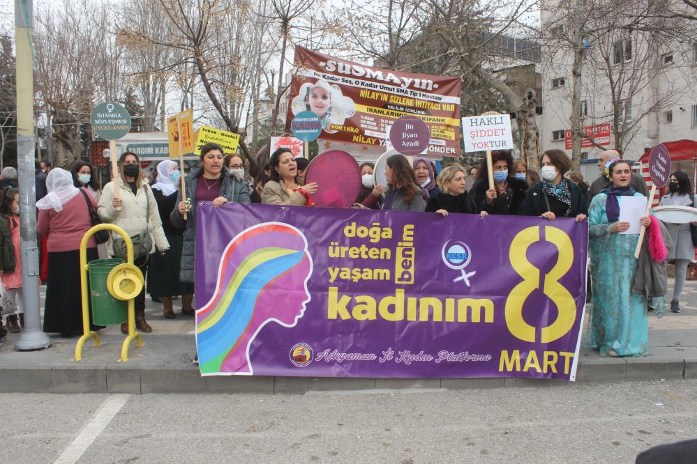 Adıyaman İl Kadın Platformu tarafından Demokrasi Parkında 8 Mart Dünya Kadınlar Gününde basın açıklaması düzenlendi. Kadına yönelik şiddete tepki gösteren Adıyaman İl Kadın Platformu üyeleri, artık kadın cinayetlerinin ve kadına yönelik şiddetin son bulmasını istedi.