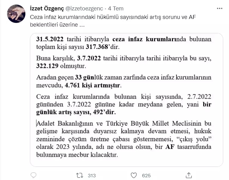 Özgenç yaptığı paylaşımda, 31 Mayıs 2022 tarihi itibarıyla ceza infaz kurumlarında bulunan toplam kişi sayısının 317 bin 368 olduğu bu sayının 3 Temmuz itibarıyla 322 bin 129’a yükseldiğini ifade etti. Ayrıca, 33 günlük sürede, ceza infaz kurumlarında 4 bin 761 kişilik artış olduğu belirtildi.