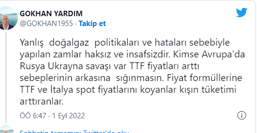 BOTAŞ Eski Genel Müdürü Gökhan Yardım, sosyal medya hesabından doğal gaz zammıyla ilgili yaptığı paylaşımda "Yanlış doğalgaz politikaları ve hataları sebebiyle yapılan zamlar haksız ve insafsızdır. Kimse Avrupa'da Rusya Ukrayna savaşı var TTF fiyatları arttı sebeplerinin arkasına sığınmasın. Fiyat formüllerine TTF ve İtalya spot fiyatlarını koyanlar kışın tüketimi arttıranlar." diyerek tepki gösterdi.
