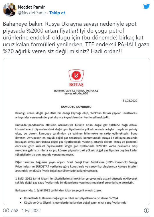 Enerji politikaları uzmanı Necdet Pamir ise, gece yarısı doğal gaza gelen zammın açıklamasına dikkat çekerek "Bahaneye bakın: Rusya Ukrayna savaşı nedeniyle spot piyasada %2000 artan fiyatlar! İyi de çoğu petrol ürünlerine endeksli olduğu için (bu dönemde) birkaç kat ucuz kalan formülleri yenilerken, TTF endeksli PAHALI gaza %70 ağırlık veren siz değil misiniz? Hadi ordan!!" diyerek paylaşımda bulundu.