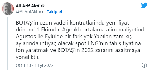 "BOTAŞ’in uzun vadeli kontratlarında yeni fiyat dönemi 1 Ekimdir. Ağırlıklı ortalama alim maliyetinde Ağustos ile Eylülde bir fark yok." diyen Enerji Uzmanı Ali Arif Aktürk ise, "Yapılan zam kış aylarında ihtiyaç olacak spot LNG’nin fahiş fiyatına fon yaratmak ve BOTAŞ’in 2022 zararını azaltmaya yöneliktir." değerlendirmesini yaptı.