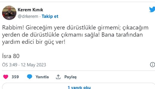 Kerem Kınık, istifasının ardından sosyal medya hesabında, “Türk Kızılay Genel Başkanı” unvanı yerine “Kızılay gönüllüsü” ifadesini kullanmaya başladı ve İsra Suresi 80. ayeti paylaştı.