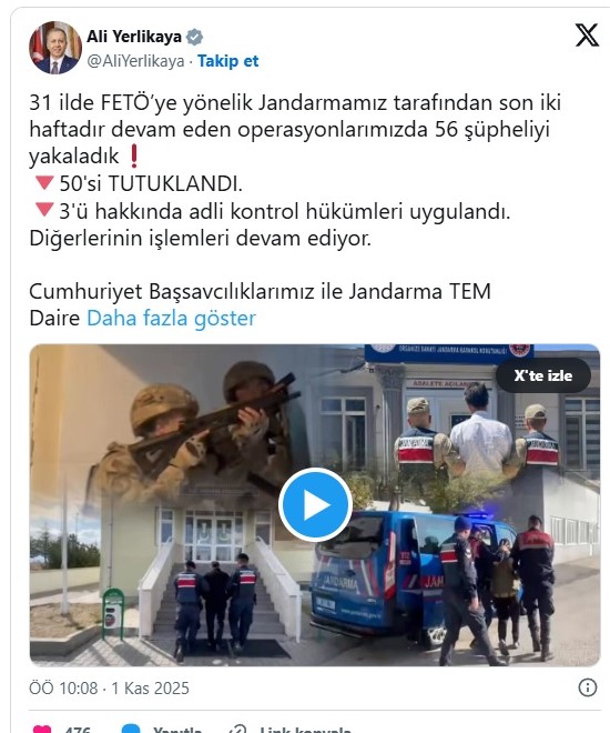İçişleri Bakanı Ali Yerlikaya, son iki haftada Adıyaman dahil 31 ilde FETÖ’ye yönelik düzenlenen operasyonlarda 56 şüphelinin gözaltına alındığını, bunlardan 50’sinin tutuklandığını açıkladı. Şüphelilerin örgütsel irtibat ve propaganda faaliyetlerinde bulunduğu tespit edildi.