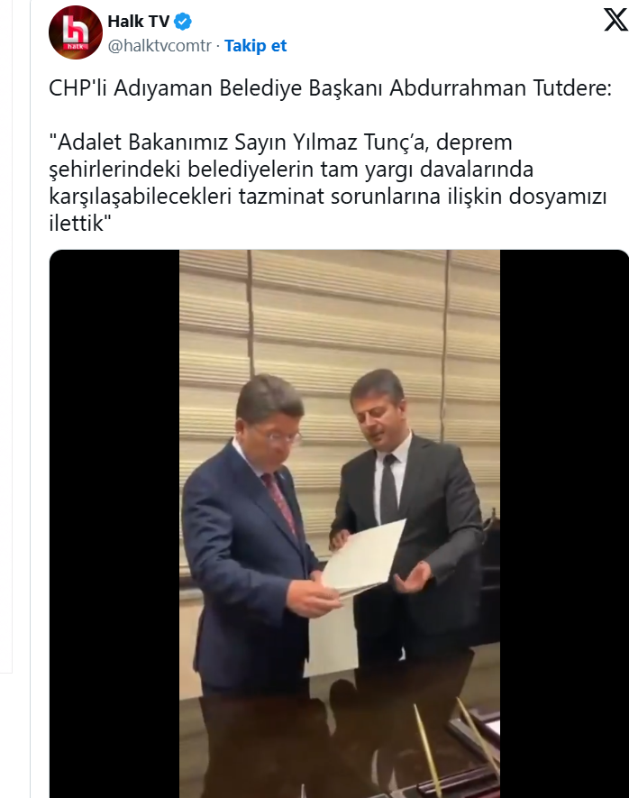 6 Şubat depremlerinde büyük yıkım yaşayan Adıyaman’da, depremzedelerin belediye aleyhine açtığı tazminat davaları sürerken, Belediye Başkanı Abdurrahman Tutdere’nin bu davaları durdurmak için Adalet Bakanı Yılmaz Tunç’tan yardım istemesi tepkilere yol açtı.