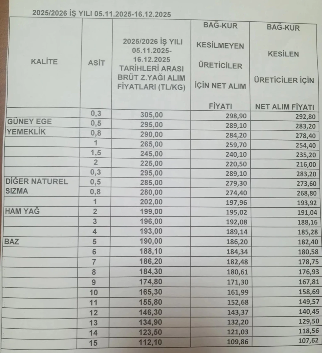 Tariş tarafından açıklanan ve asit oranına göre değişen güncel alım fiyatları şu şekilde listelendi: