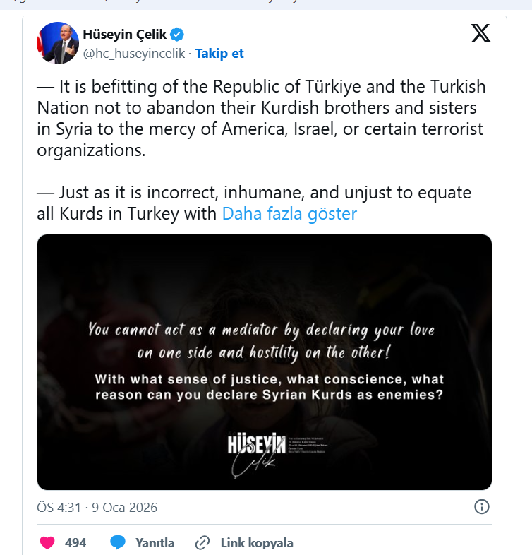 AK Parti hükümetlerinde Milli Eğitim ile Kültür ve Turizm Bakanlığı görevlerinde bulunan Hüseyin Çelik, sosyal medya hesabı X üzerinden İngilizce yaptığı paylaşımla Ankara'nın Suriye stratejisine dair dikkat çeken değerlendirmelerde bulundu. Türkiye'nin Suriyeli Kürtleri "ABD'nin, İsrail'in veya terör örgütlerinin insafına terk etmemesi gerektiğini" vurgulayan Çelik, Kuzey Irak ile kurulan ilişkileri örnek göstererek diyalog çağrısı yaptı.