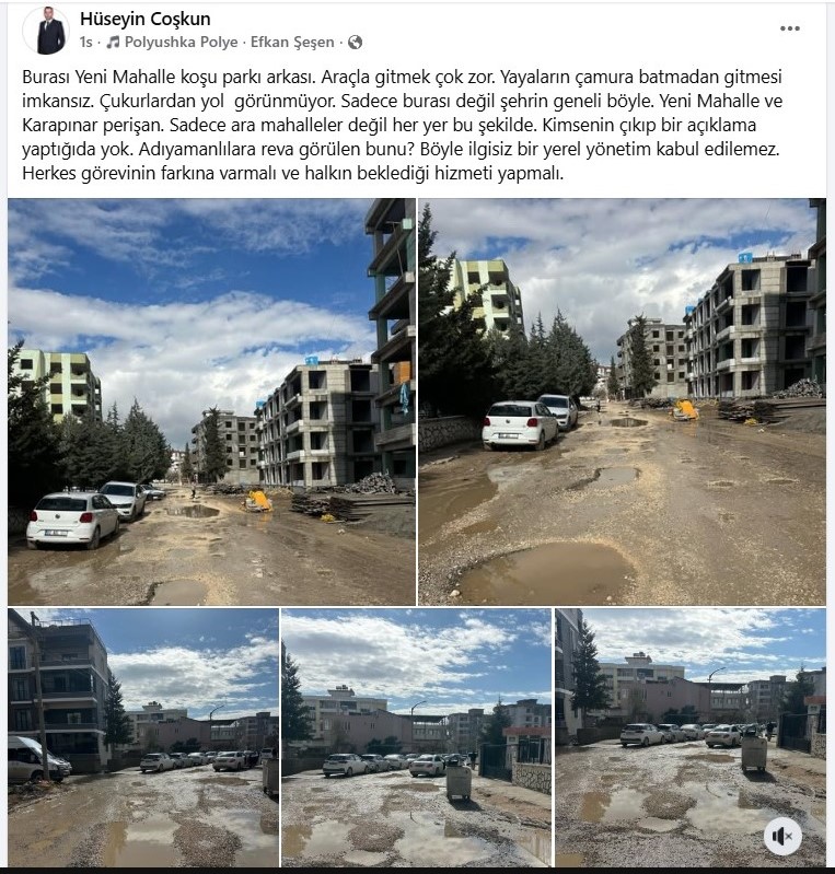 DEM Parti Adıyaman eski il eş başkanı Av. Hüseyin Coşkun, özellikle Yeni Mahalle ve Karapınar’da yaşanan yol sorununa dikkat çekerek yerel yönetime sert tepki gösterdi.