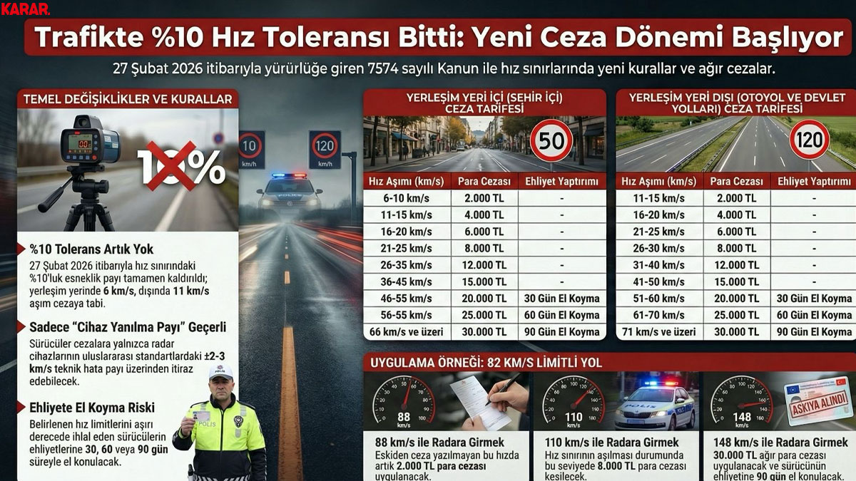 27 Şubat 2026 tarihinde Resmi Gazete'de yayımlanarak yürürlüğe giren 7574 sayılı Kanun ile Karayolları Trafik Kanunu'nun 51. maddesi baştan aşağı yenilendi. Sürücülerin yıllardır alışkın olduğu ve radar cezalarından kaçınmak için kullandığı "%10'luk esneklik payı" resmen iptal edildi. İçişleri Bakanlığı'nın yaptığı açıklamayla netleşen yeni sistemde, cezalar kilometre bazlı kademelendirilerek 2.000 TL'den 30.000 TL'ye kadar çıkıyor.