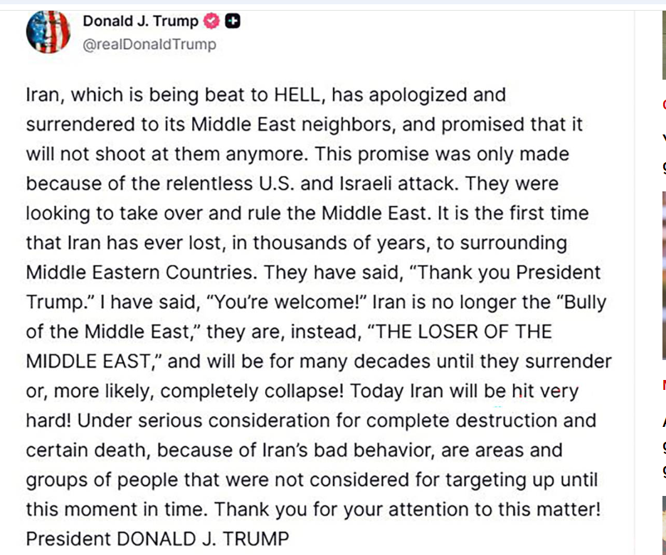 Mesajına İran'ın ağır bir yenilgi aldığını savunarak başlayan Trump, "Cehenneme çevrilen İran, Orta Doğu'daki komşularına özür diledi, teslim oldu ve bir daha onlara ateş etmeyeceğine dair söz verdi" ifadelerini kullandı. Trump, İran'ın binlerce yıl sonra ilk kez çevresindeki ülkelere karşı kaybettiğini iddia ederek, Arap ülkelerinin liderlerinin kendisine "Teşekkürler Başkan Trump" dediğini, kendisinin de "Rica ederim" yanıtını verdiğini aktardı.