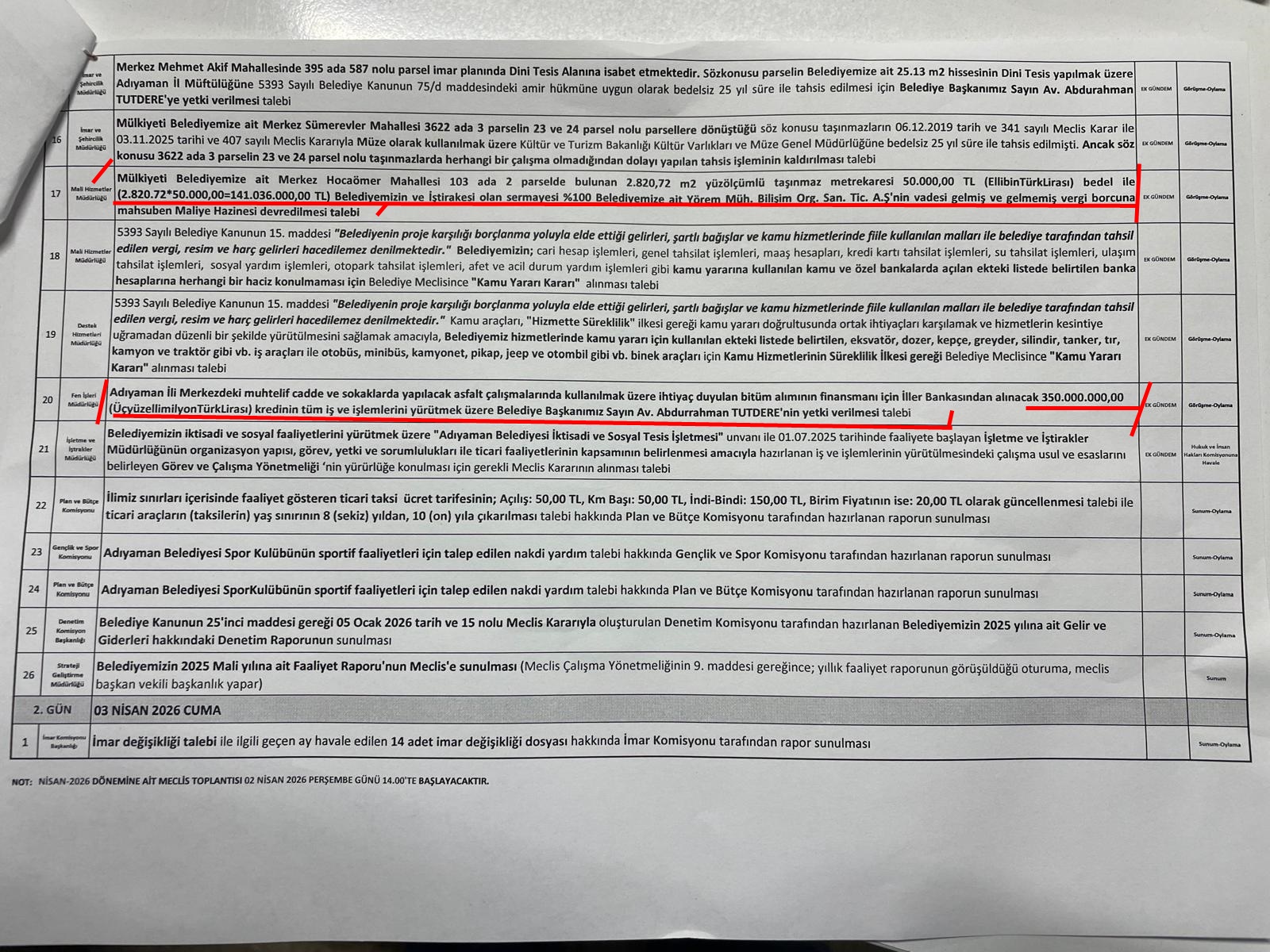 Adıyaman Belediyesi’nin mali politikaları ve son dönemdeki uygulamaları kamuoyunda tartışma konusu olmaya devam ediyor. Borçsuz devralındığı belirtilen belediyenin kısa sürede yüksek miktarda kredi kullanmasının ardından, şimdi de belediyeye ait taşınmazların satışa çıkarılması dikkat çekti.