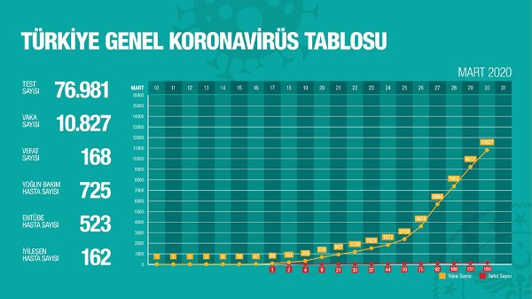 Türkiye'de ilk vakası 11 Mart’ta görülen korona virüsü, can almaya devam ediyor. Sağlık Bakanı Fahrettin Koca, bugün virüs nedeniyle 37 kişinin hayatını kaybettiğini açıkladı. Bakan Koca, toplam test sayısının 76 bin 981, toplam vaka sayısının 10 bin 827, vefat sayısının 168, yoğun bakım hasta sayısının 725, entübe hasta sayısının 523, iyileşen hasta sayısının 162, bugünkü test sayısının 11 bin 535, bugünkü vaka sayısının bin 610 ve bugünkü vefat sayısının 37 olduğunu bildirdi.