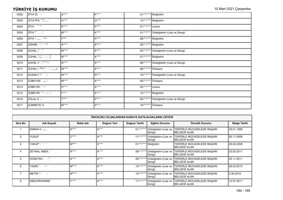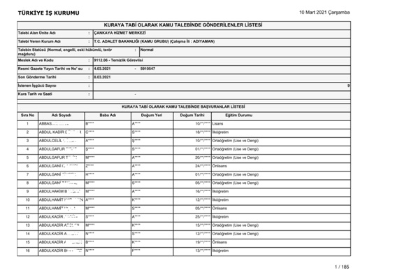 Adalet Bakanlığı, Adıyaman il ve ilçelerde görevlendirilmek üzere İŞKUR üzerinden 9 kişilik temizlik kadrosu açtı.9 kişilik kadroya, bin 443'ü üniversite mezunu olmak üzere toplamda 5 bin 226 kişi başvuruda bulundu. İşe alınacaklar 17 Mart 2021 tarihinde çekilecek kura ile belirlenecek.