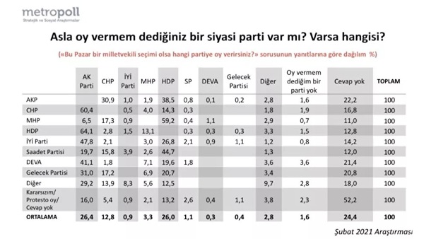 MetroPOLL, "Asla oy vermem dediğiniz siyasi parti var mı?" sorusunu yönelttiği anketin sonuçlarına göre, AK Partili seçmenler CHP, CHP'li seçmenler AK Parti, HDP'li seçmenler AK Parti ve İYİ Partili seçmenler ise AK Parti dedi.